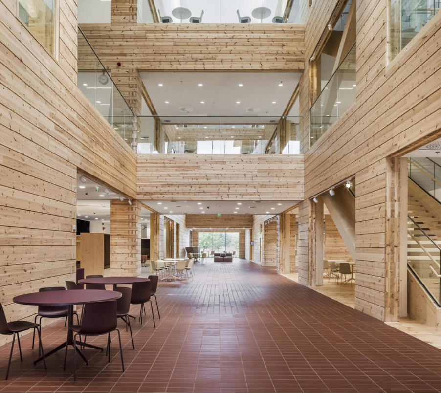 AOR Architects designed the Tuusula High School and Cultural Centre in Tuusula, Finland. The project uses industrial timber log for a large public building. The space is a high school during the day, but then used by the local music school, arts school, community college and municipal cultural services at night.