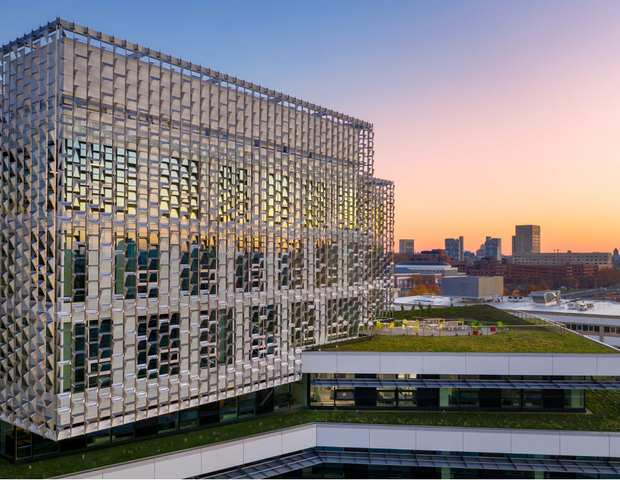 Behnisch Architekten completed a new academic building for Harvard University that features hydroformed stainless steel screens that are designed to mitigate solar heat gain during warm months while allowing sunlight to penetrate during the winter. The building also includes shading devices, natural ventilation, solar panels, vegetated roof terraces, efficient systems for lighting, heating and cooling.