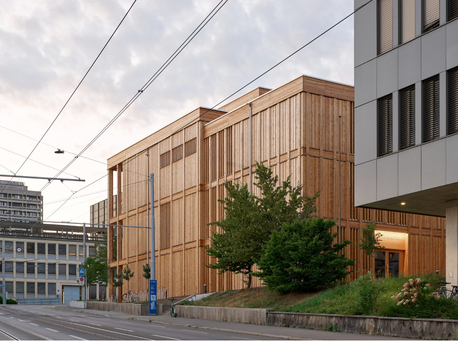 Swiss architecture studio Itten + Brechbuhl created a temporary timbre university sports hall in Zurich, with aspirations for its demountable construction to be “the new standard in architecture”. The building replaces four sports halls at the University of Zurich with glued laminated timbre structure clad in larch timber. The three-story building is made to be easily deconstructed after ten years of use.