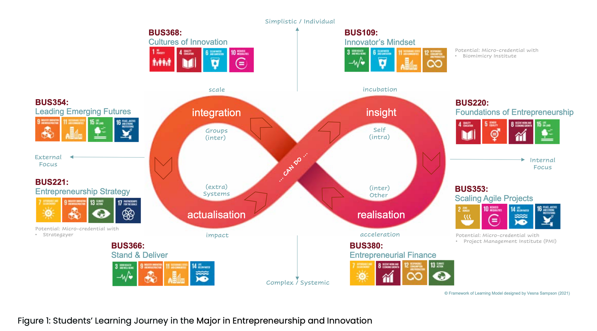 Murdoch Business School in Australia recently launched a newly developed Major in Entrepreneurship and Innovation that is deeply connected to the SDGs. Each of the eight units in the major are project-based and have specific UNSDG thematic foci. To complete each unit, students must apply their knowledge in the unit discipline (finance, project management, etc.) to a selected UNSDG challenge, requiring them to develop knowledge, insight and awareness in both areas.